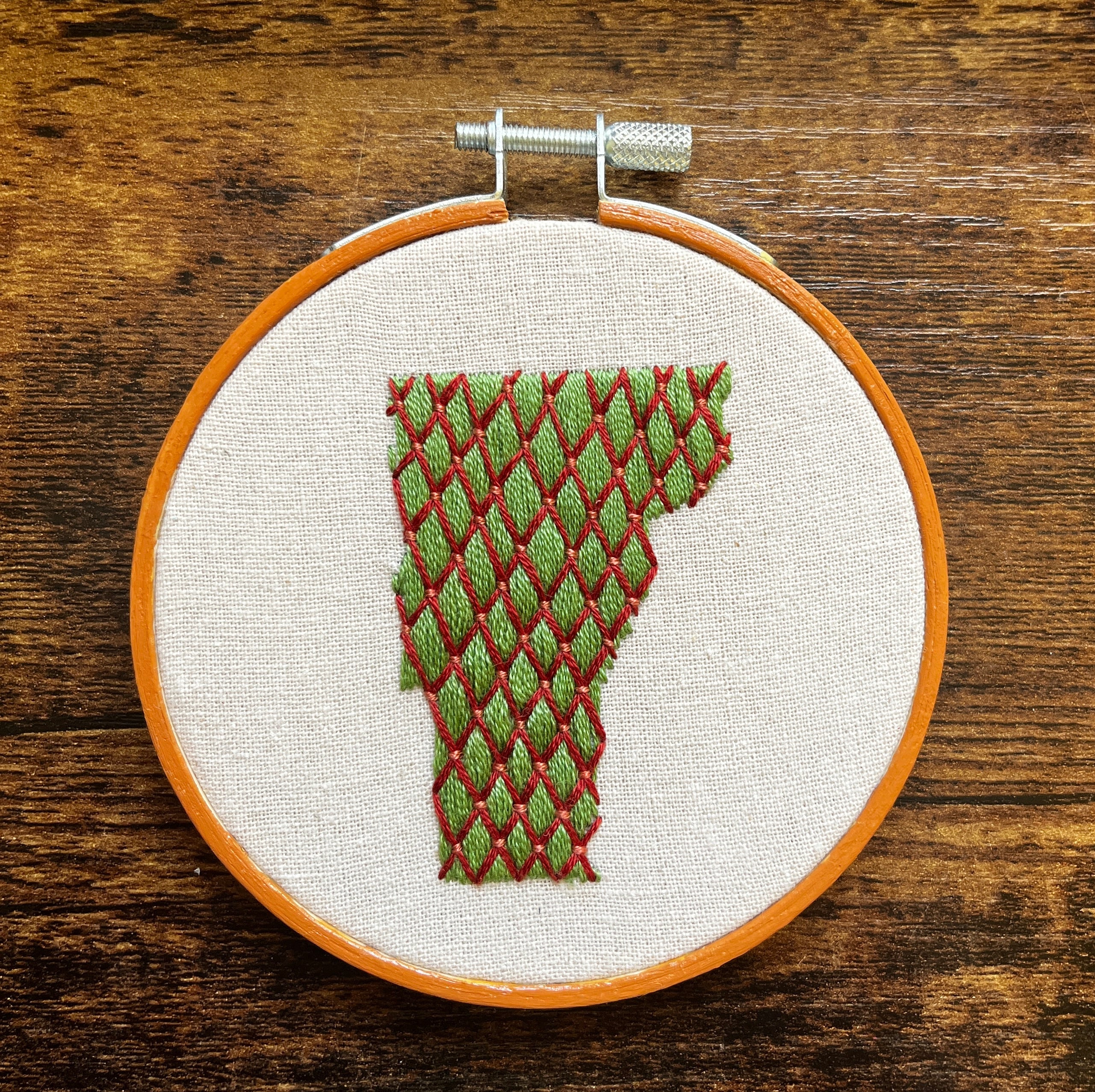 An embroidered map of Vermont, stitched by hand using trellis stitch and couching stitch on white cotton.