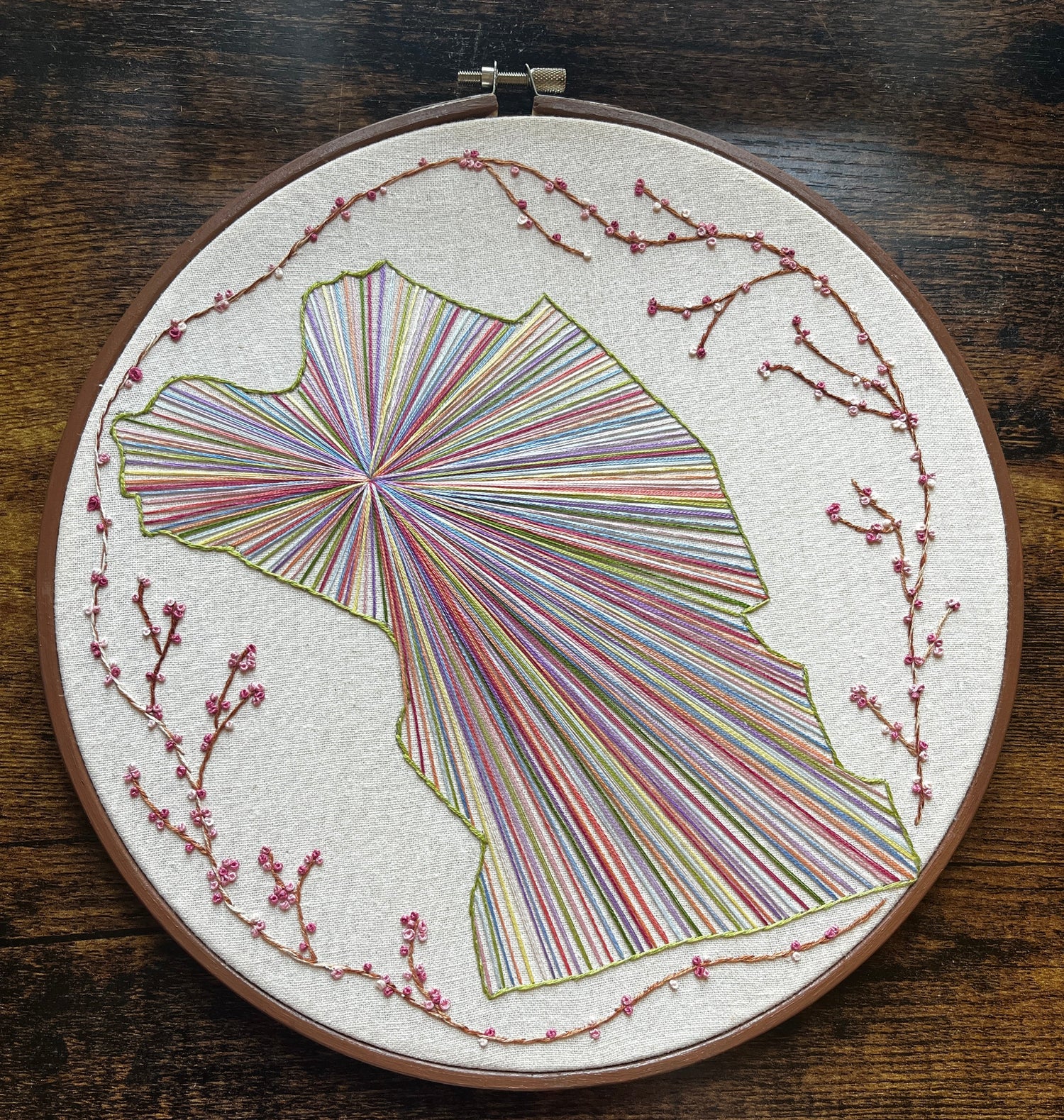 10-inch hoop of Middleboro, MA. All the thread lead to the couple's home. The town is surrounded by cherry blossoms which are in the couple's backyard.