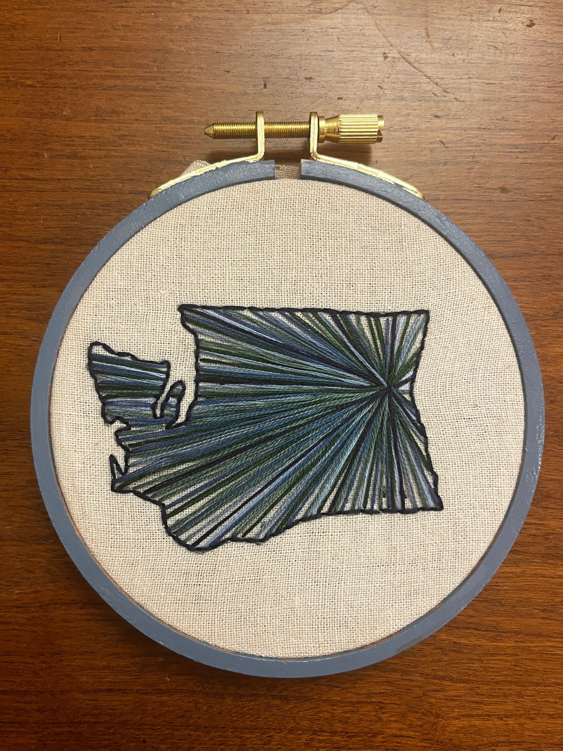 A 4-inch embroidered map of Washington, framed in a painted wooden hoop. Stitched by hand using straight stitch on light grey linen. All the stitches lead to Spokane, WA.