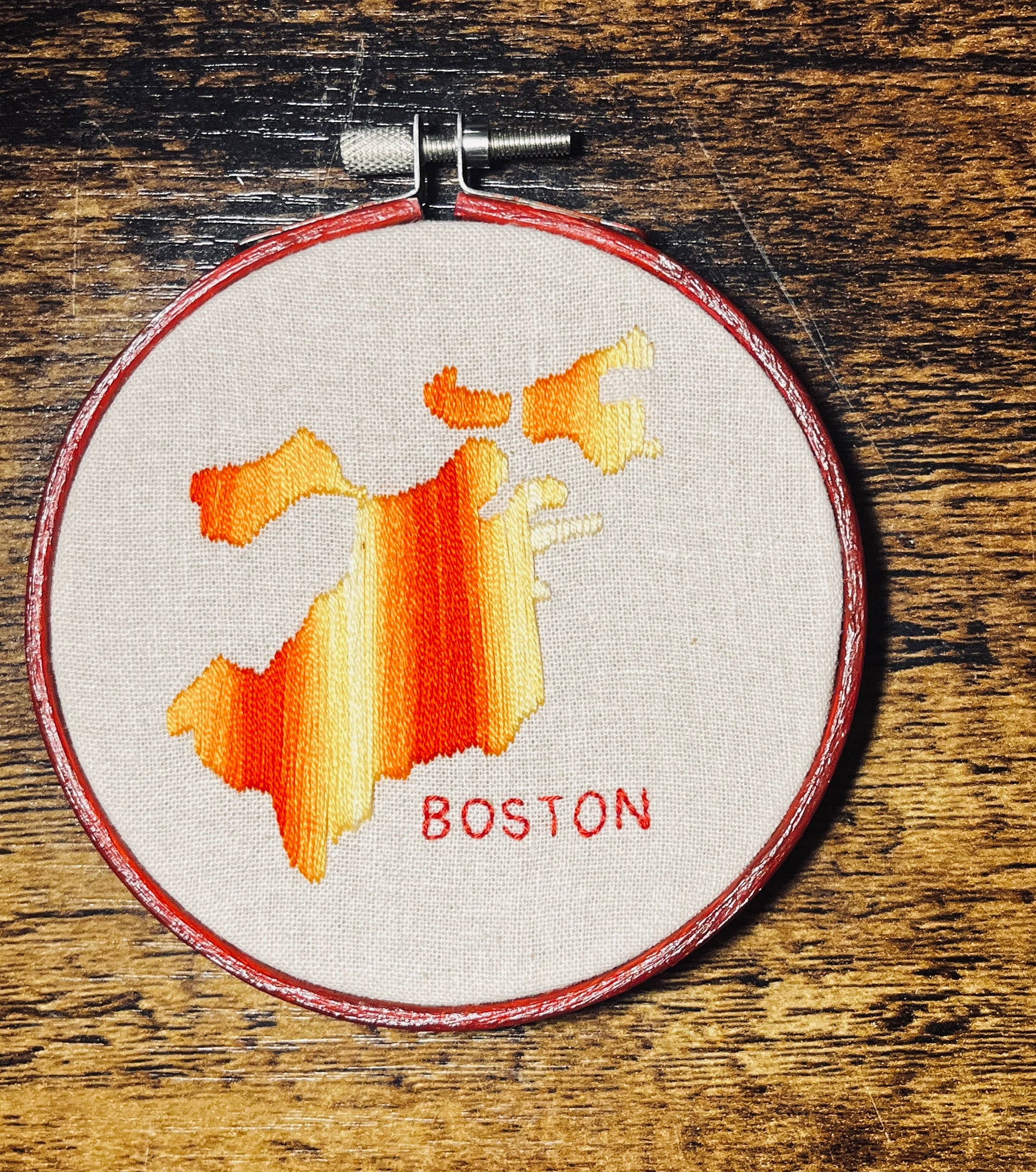 A 4-inch embroidered map of Boston, Massachusetts, framed in a wooden hoop. Stitched by hand using satin stitch on light grey linen.