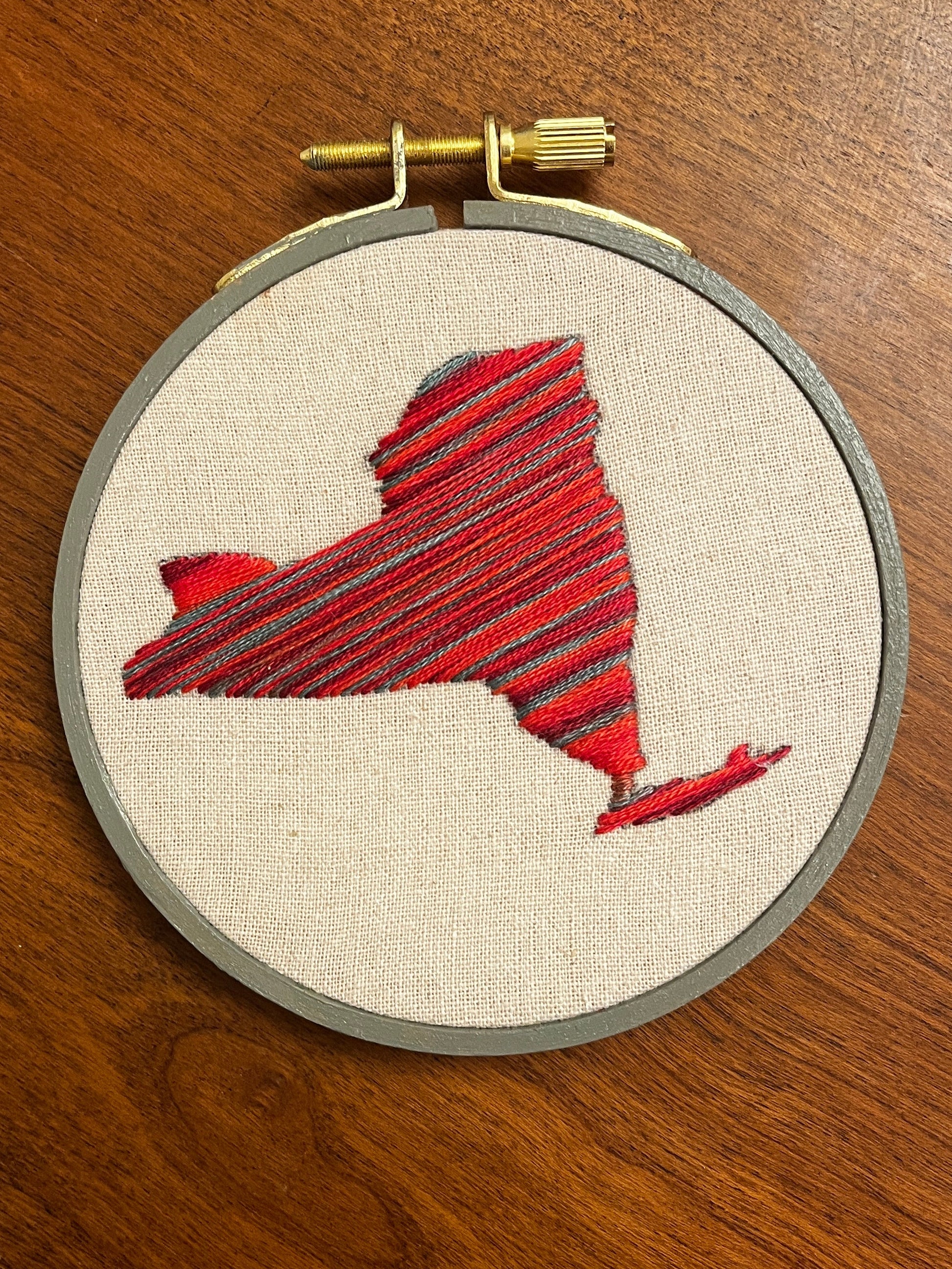 A 4-inch embroidered map of New York State framed in a painted wooden hoop. Stitched by hand using straight stitch on a white linen.