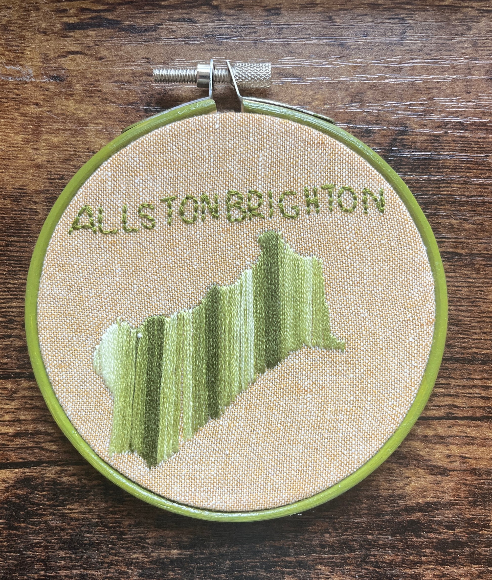 A 4-inch embroidered map of Allston-Brighton, MA in a painted wooden hoop. Stitched by hand using straight stitch on a tan linen.