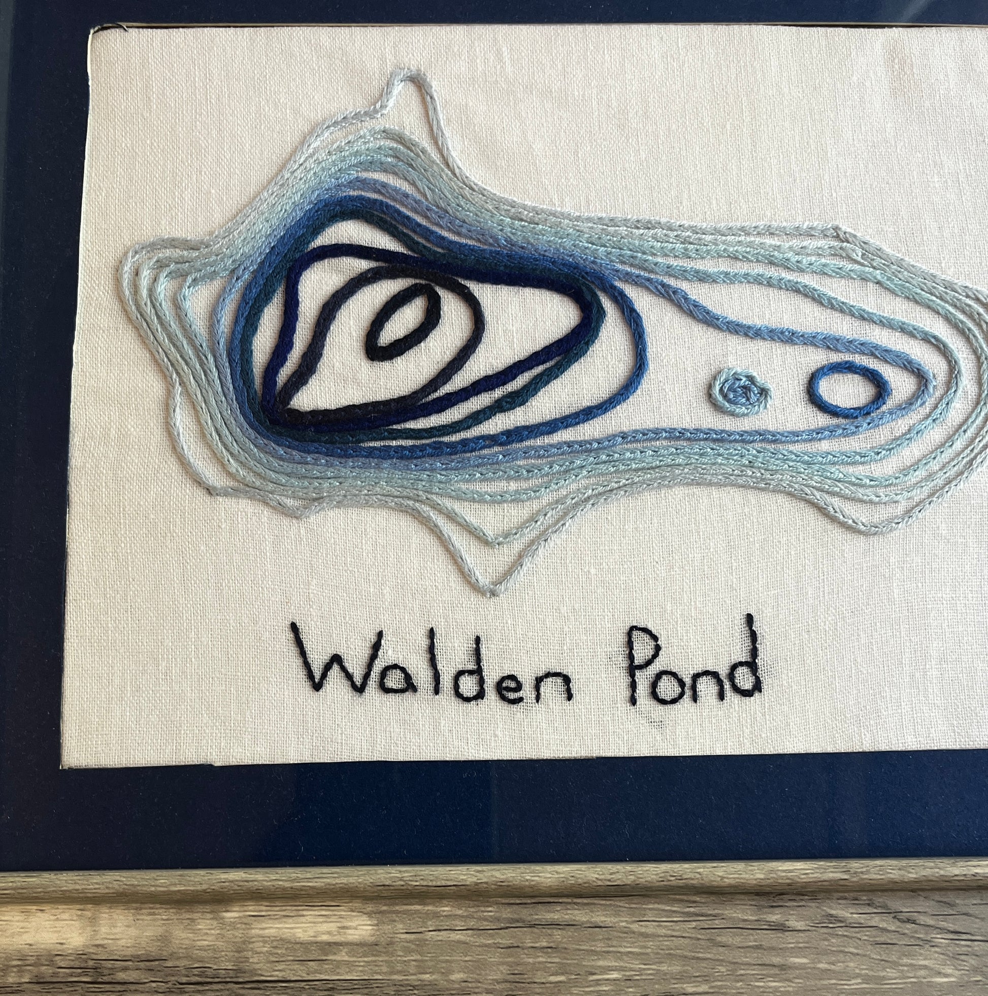 A 8x10-inch framed embroidered depth map of Walden Pond in Concord, Massachusetts. Created by hand using heavy chainstitch and back stitch back stitch on white cotton.