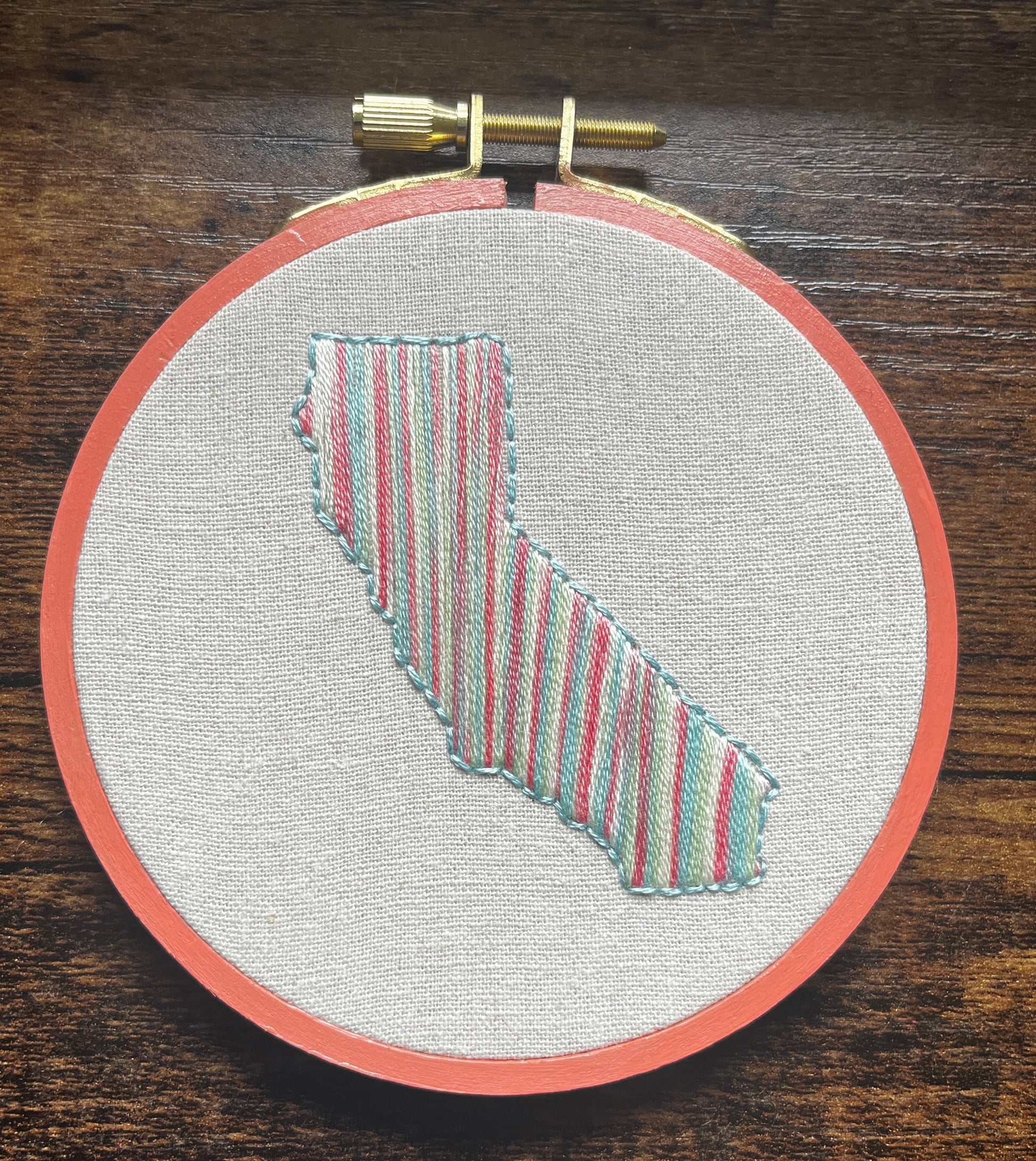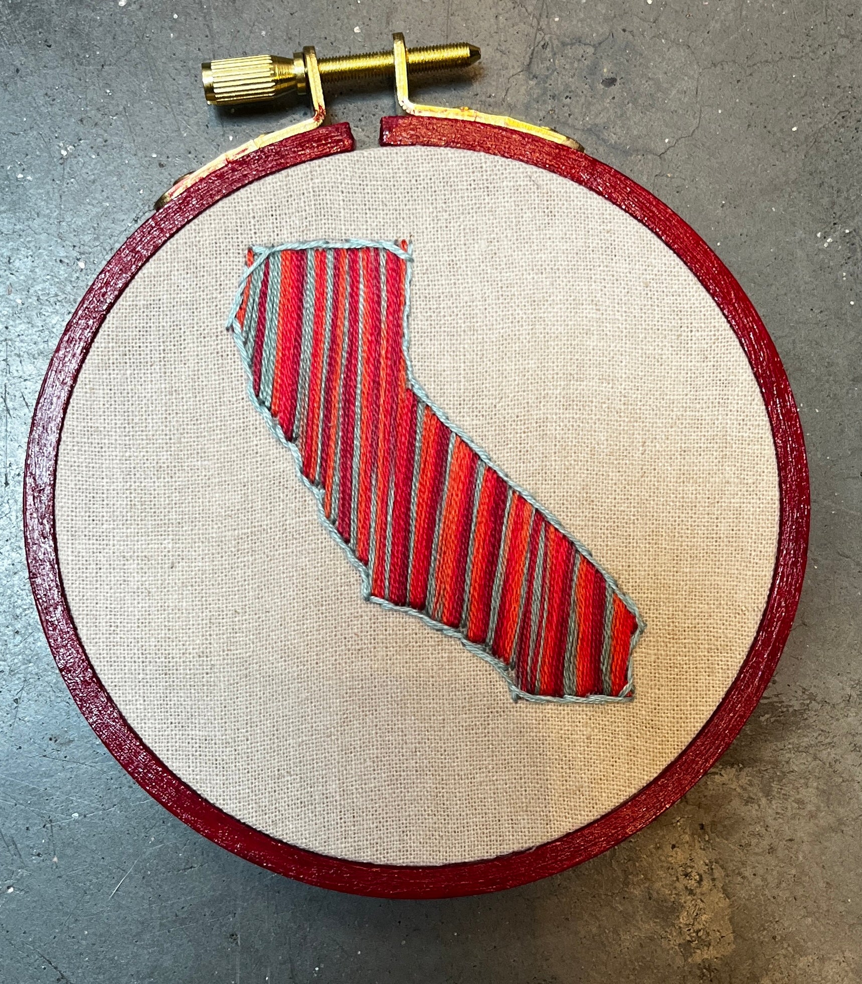 A 4-inch embroidered map of California, framed in a painted wooden hoop. Stitched by hand using straight satin on light grey linen.