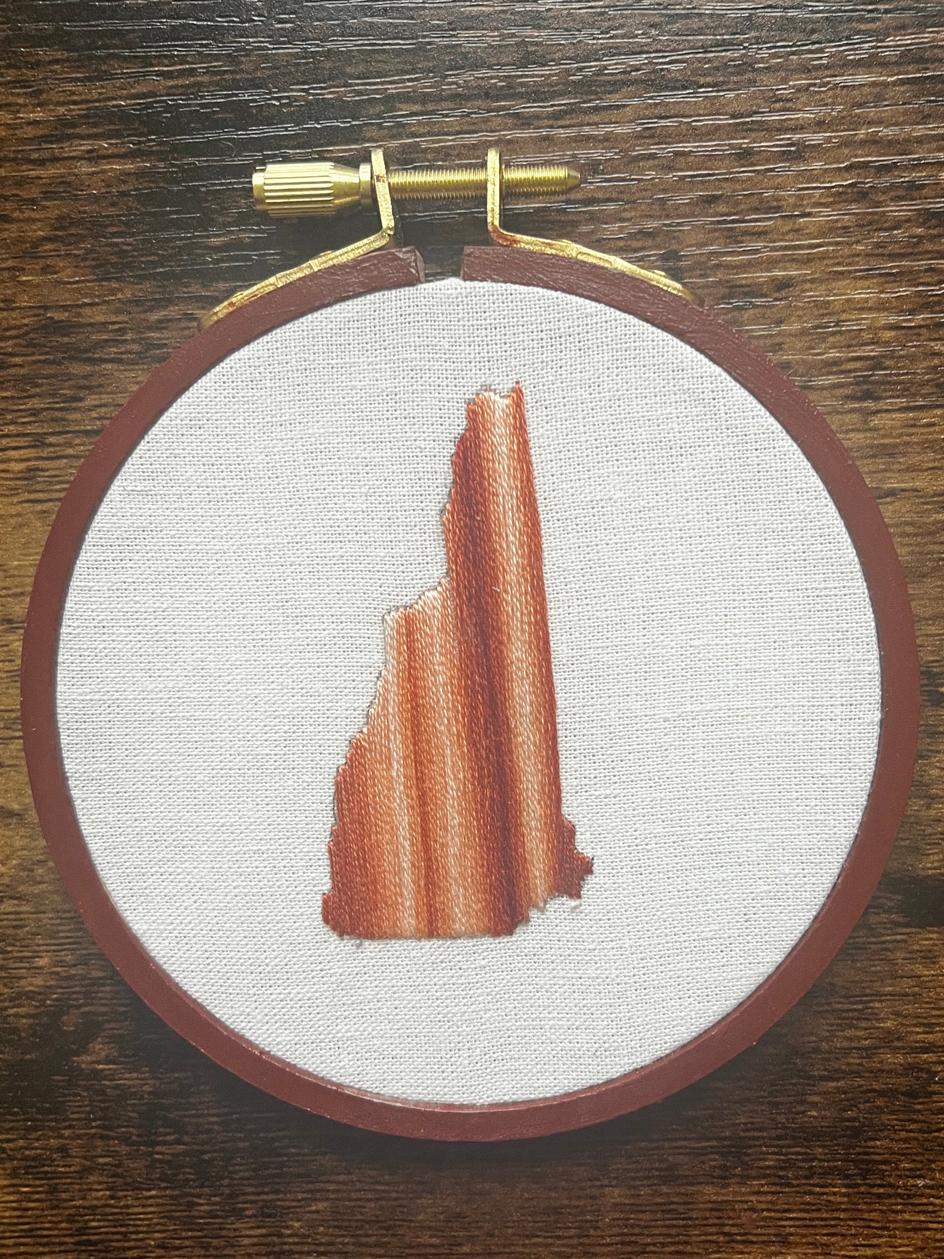 A 4-inch embroidered map of New Hampshire, framed in a wooden hoop. Stitched by hand.